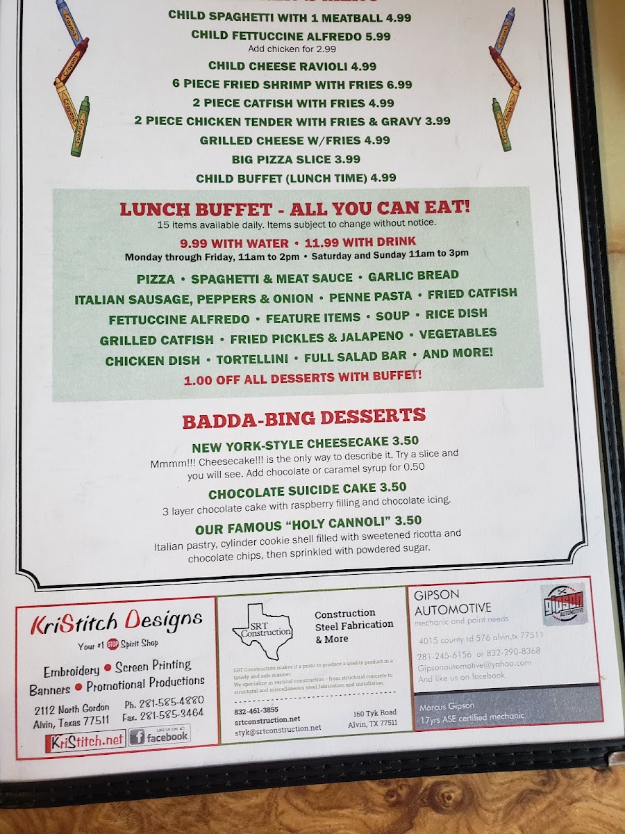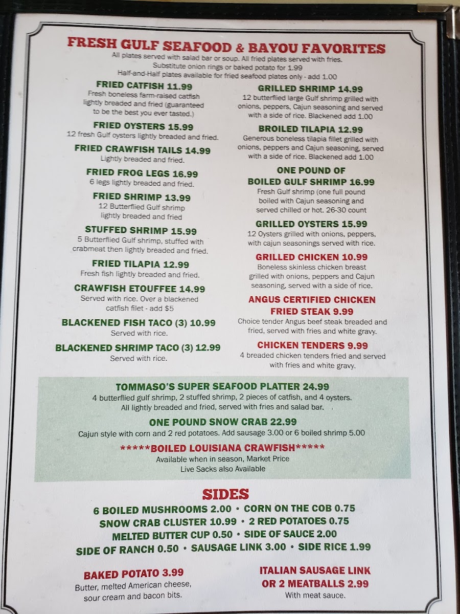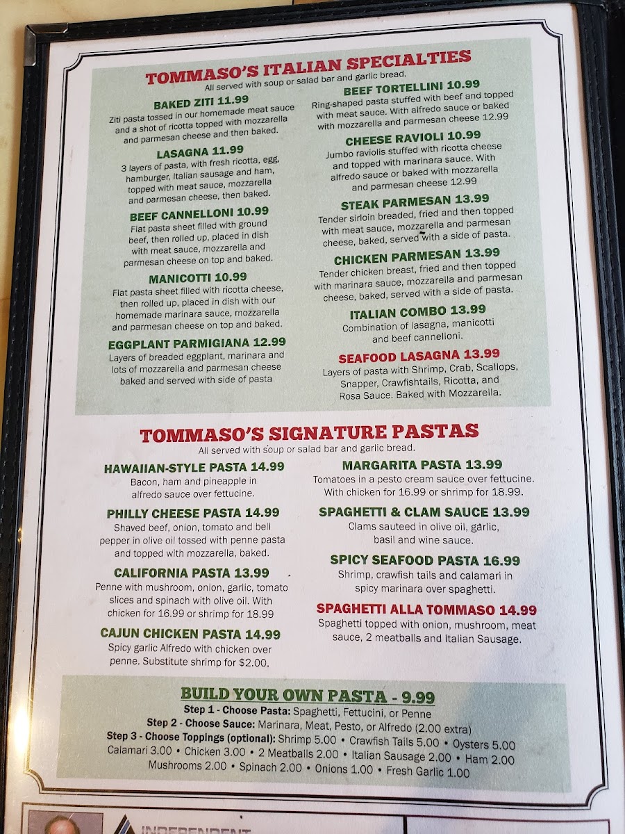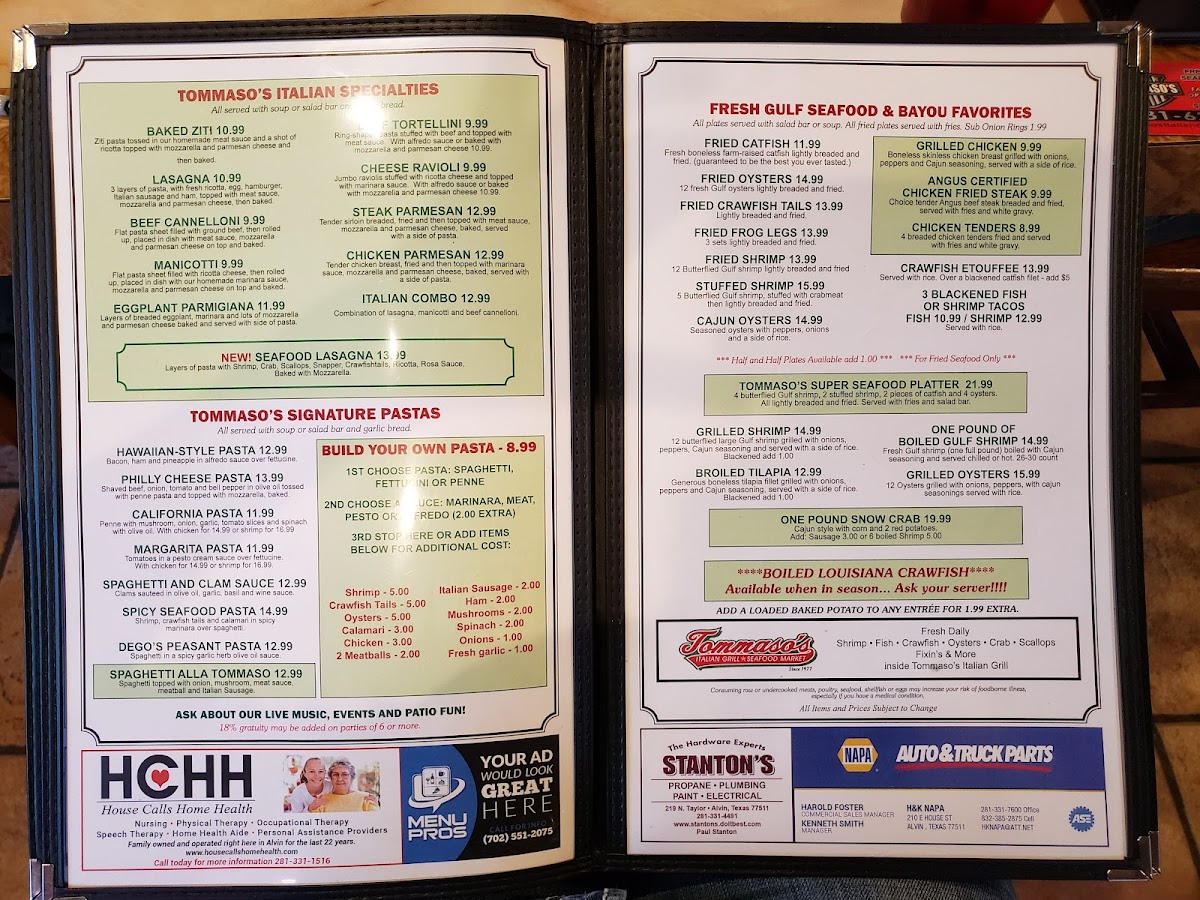 If you're craving a comforting meal full of flavor, Tommaso's Menu has something for everyone. Located at 507 N Gordon St in Alvin, TX, this cozy spot serves up classic dishes that will make you feel right at home. Whether you're in the mood for a hearty pasta, a deliciously seasoned pizza, or something a little lighter, their offerings are sure to satisfy. The atmosphere is warm and inviting, perfect for a laid-back lunch or dinner with friends and family. Every dish on Tommaso's Menu is crafted with fresh ingredients, making each bite taste like it was made just for you. The variety ensures that no matter what your taste preferences are, you'll find something to love. Come in and enjoy a great meal - it's all about good food, good company, and good times.