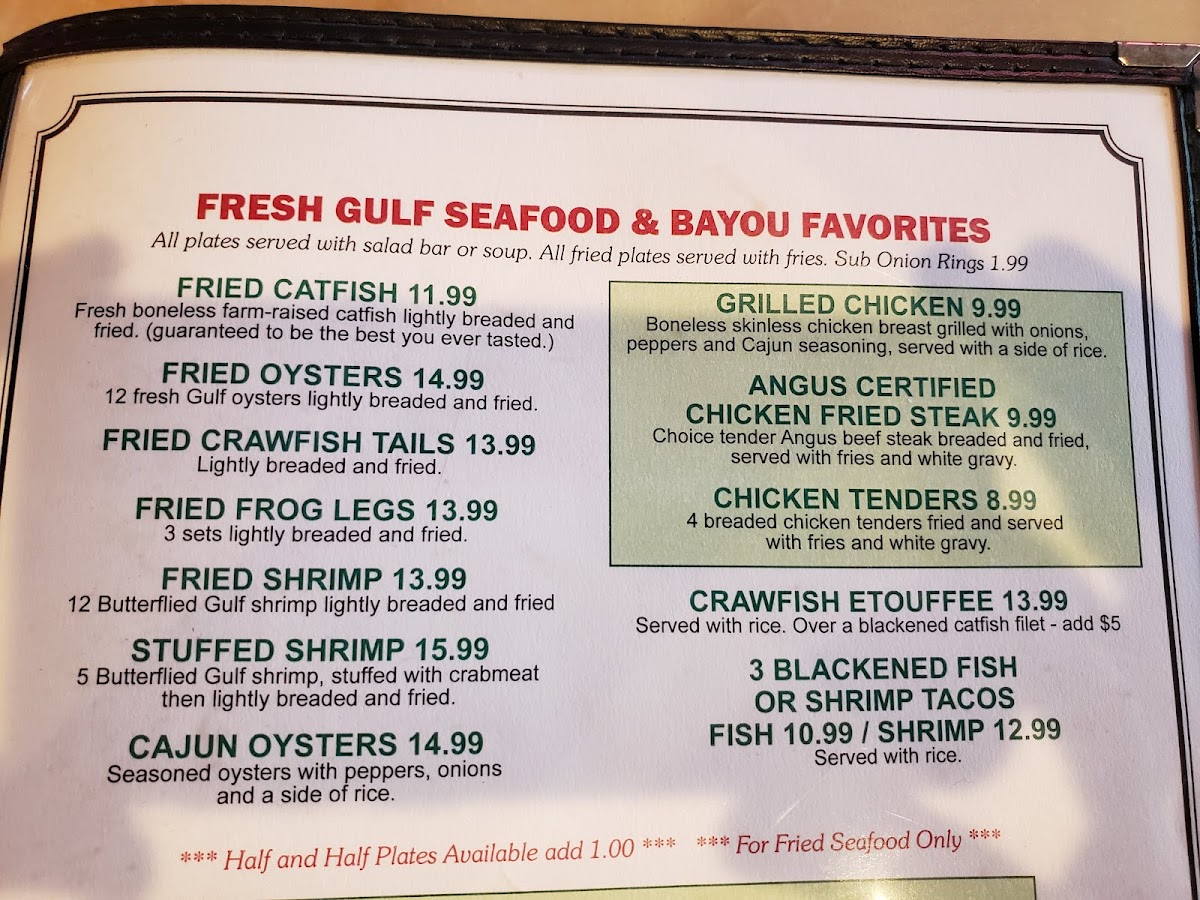4 Butterflied gulf shrimp, 2 stuffed shrimp, 2 pieces of catfish & 4 oysters. All lightly breaded and fried. Served with fries.